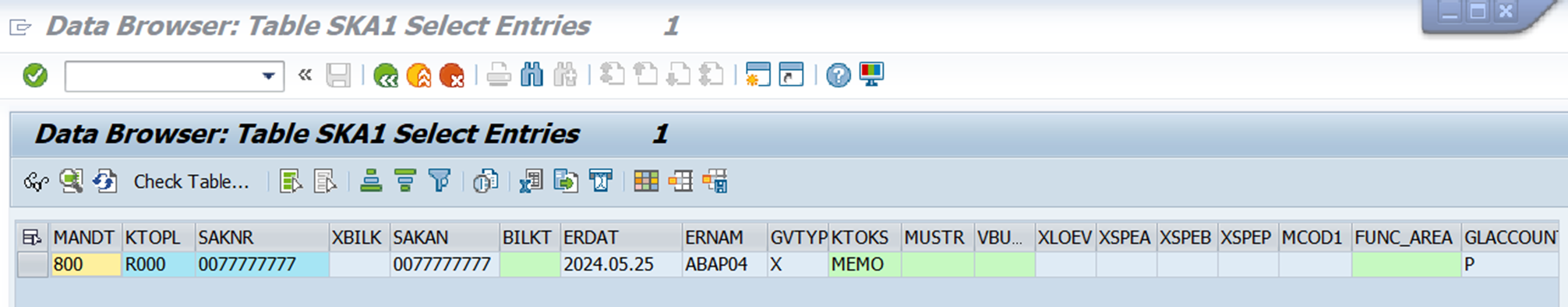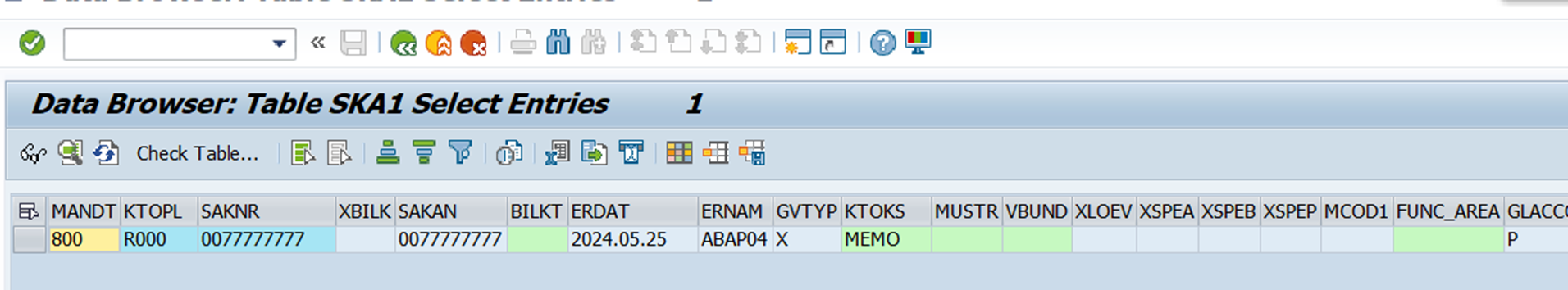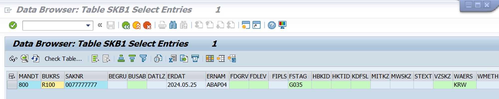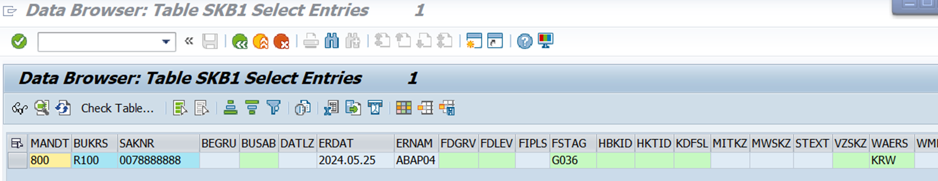 2. SKA1(계정과목을 관리하는 테이블)에 생성된 계정과목 확인 가능하다