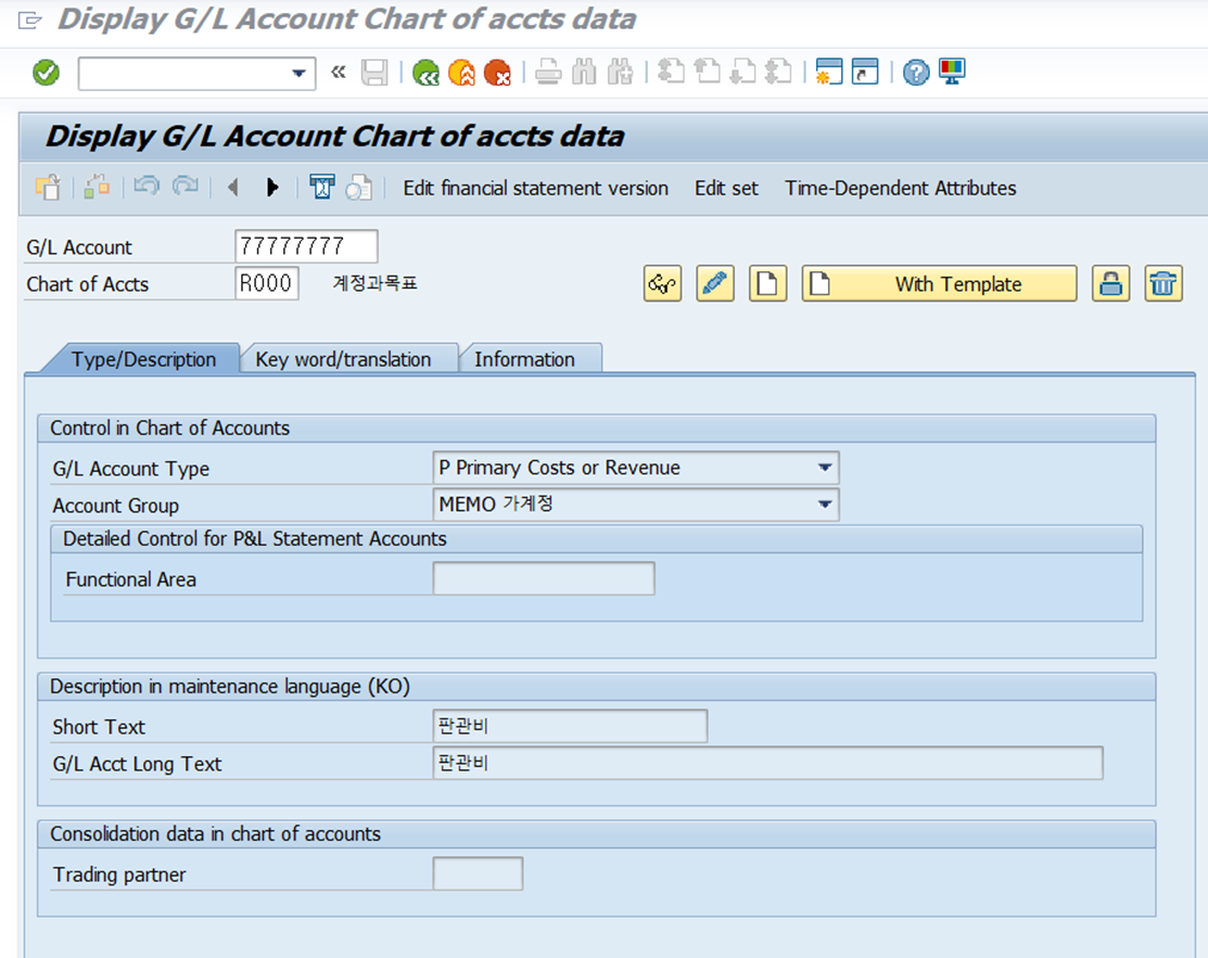 계정에 대한 간단한 설명을 입력하는 곳입니다. 이 설명은 계정 번호 옆에 표시되며, 사용자가 해당 계정에 대한 빠른 이해를 돕습니다. - G/L Acct Long Text 입력