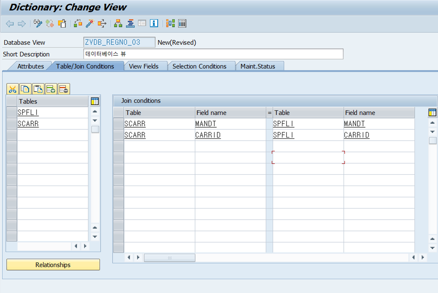 3. Database View(데이터베이스 뷰)와 는 달리, 오직 연관된 테이블들 만이 조인이 됩니다. 화면에서 Table/Join Conditions 탭 아래의 Relationships 버튼을 클릭하여 조인 테이블을 선택하세요. 아래 그림에 표시된 대로 조인 테이블을 선택합니다.
