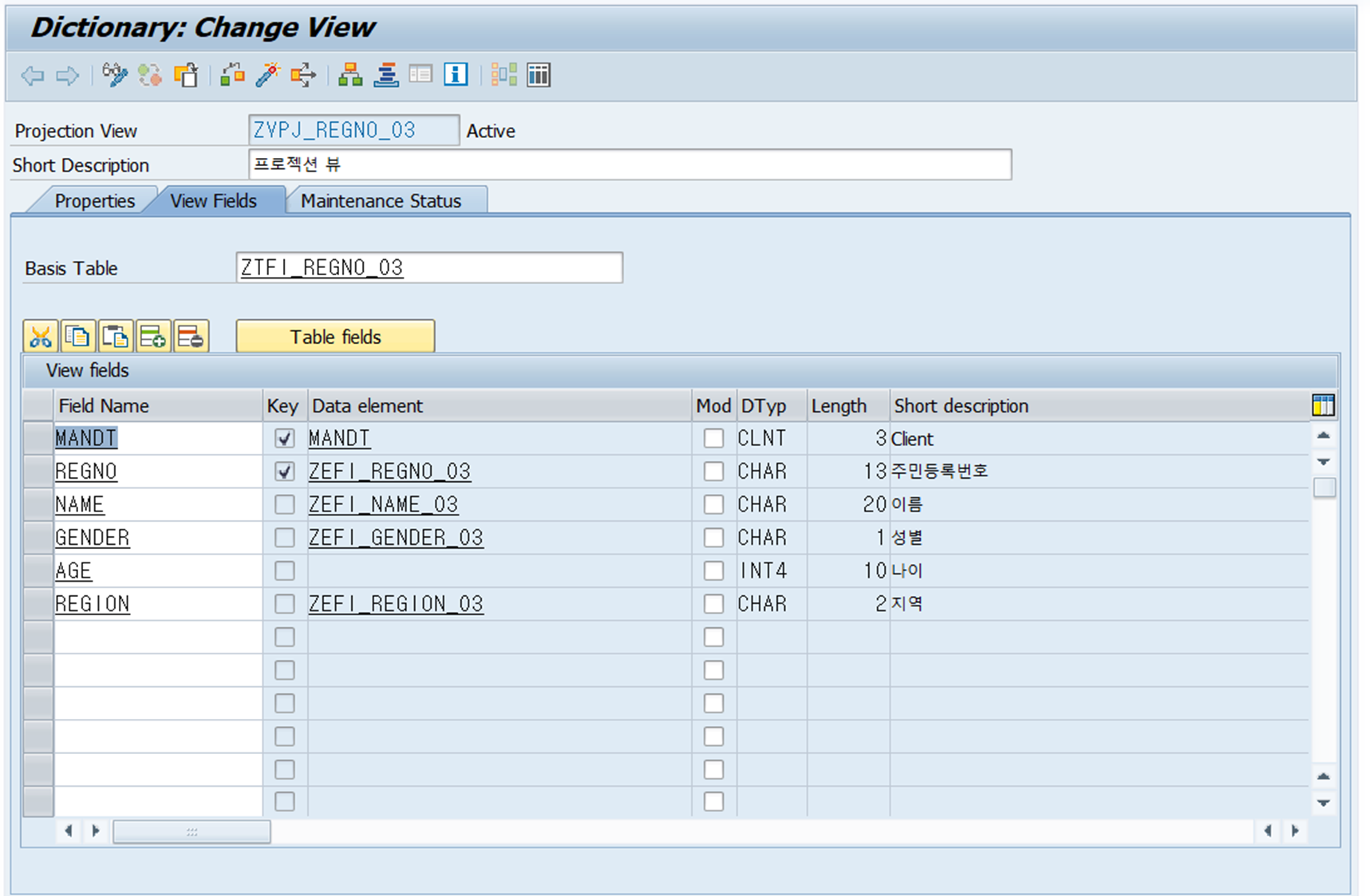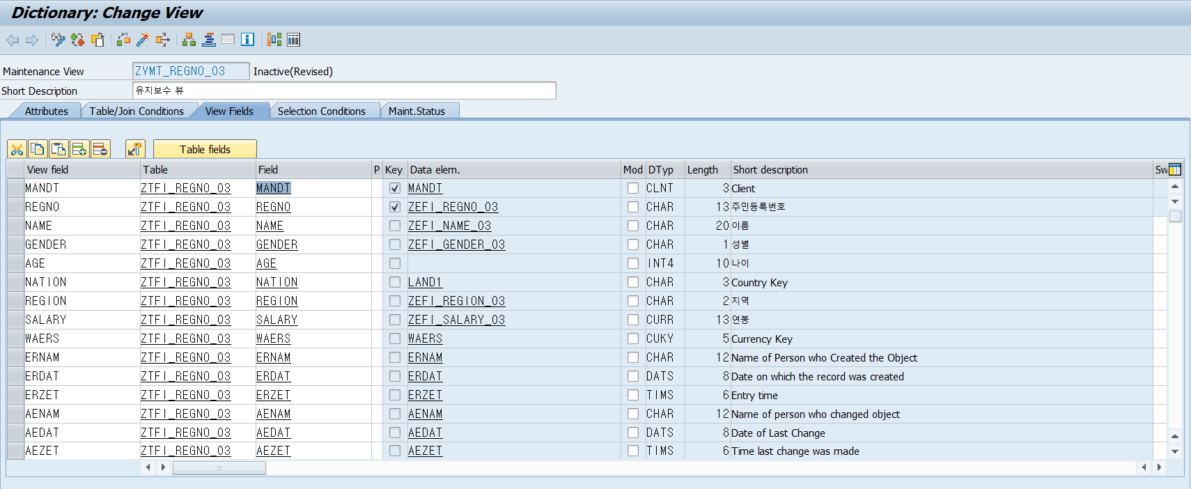 5. view 탭에서 Table fields 버튼을 클릭하면 아래와같이 필드를 가져올 수 있습니다.