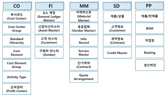 ERP 시스템 기능을 지원하기 위해 구성되는 데이터의 기준과 업무의 기준이 되는 모든 정보로 각 시스템 및 데이터의 소통을 위해 사전에 정의된 기준을 말합니다. ERP내에 프로세스가 효과적으로 실행되기 위해서는 Process간에 주고 받는 마스터 데이터가 정확성(Accuracy), 신속성(Timeliness), 신뢰성(Reliability), 활용성(Utilization)을 지니고 있어야 합니다.