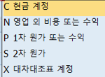 - 예를 들어, 자산 계정 그룹은 C (현금 계정) 또는 P (1차 원가/수익) 유형을 가질 수 있습니다.