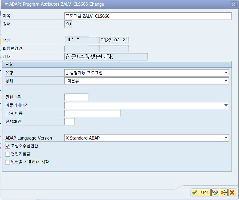 4. ABAP 프로그램 속성(Program Attributes) 설정 화면입니다. 저장 클릭!