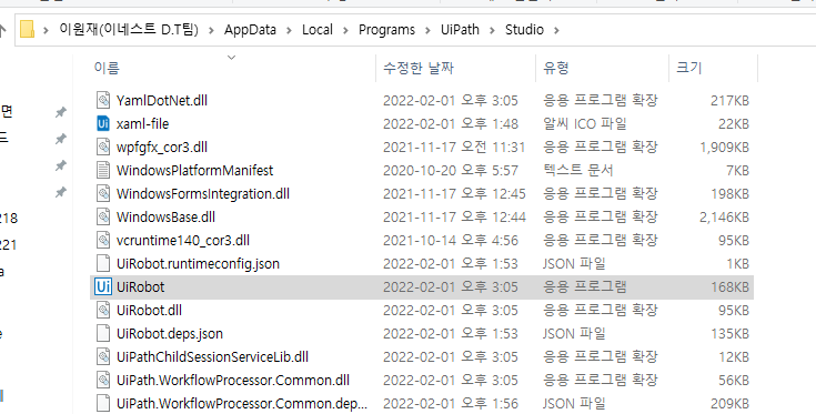 3. UiRobot 위치 확인하기. (C:\Users\LEE_WONJAE04\AppData\Local\Programs\UiPath\Studio\UiRobot.exe)